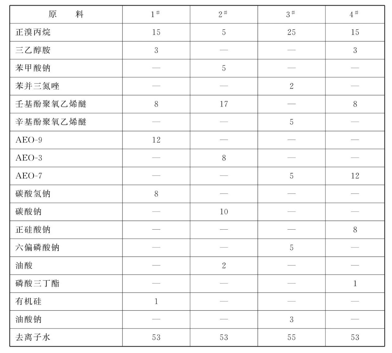[原料配伍]本品各组分质 量份配比范围为:有机溶剂5~ 25、缓蚀剂2~5、表面活性剂10~25、无机盐5~ 10、消泡剂1~3、去离子水加至100。