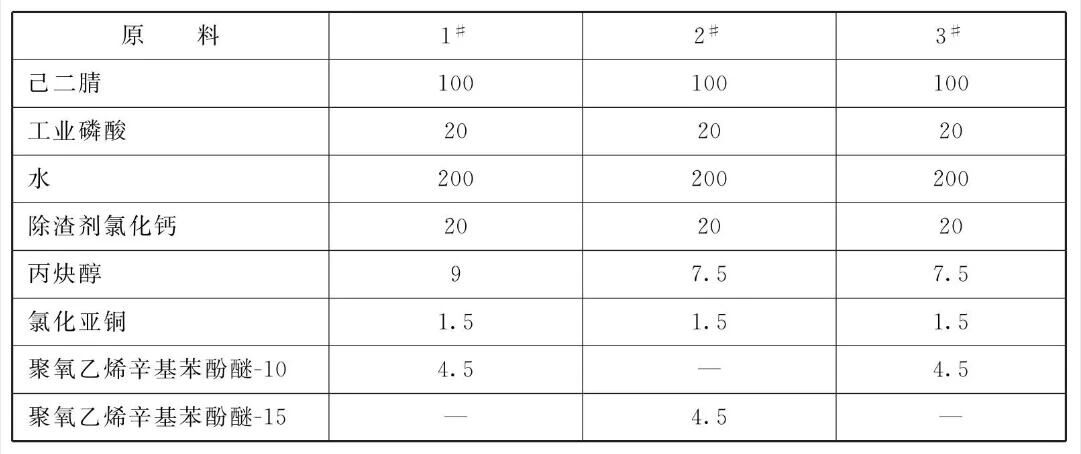 [原料配伍]本品各组分质量份配比范围为:己二腈100、工业磷酸19~21、水200、除渣剂氯化钙19~21、丙炔醇7.5~9、氯化亚铜1.4~ 1.6、 聚氧乙烯辛基苯酚醚10或聚氧乙烯辛基苯酚醚-154.4 ~4.6。