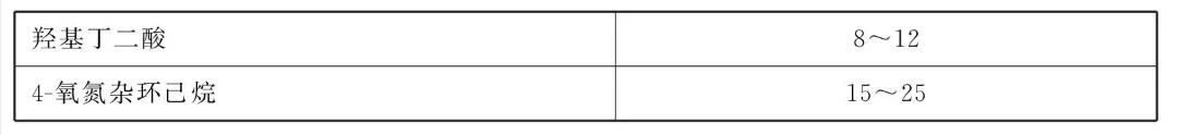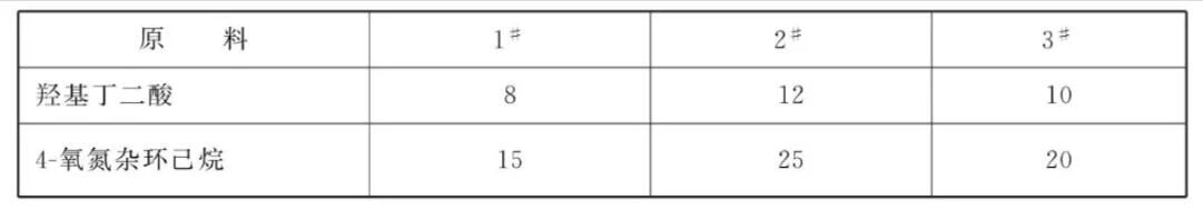 [原料配伍]本品各组分质量份配比范围为:羟基丁二酸8~12、4-氧氮杂环己烷15~ 25。