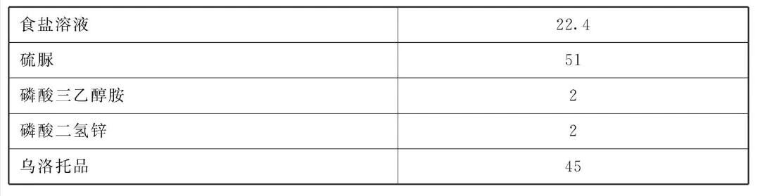 [原料配伍]本品各组分质量份配比范围为:硫脲41~61、磷酸三乙醇胺0.5~3.5、磷酸二氢锌0.5~ 3.5、乌洛托品35~55。