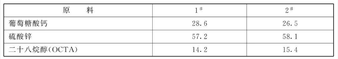 [原料配伍]本品各组分质量份配比范围为:葡萄糖酸钙25~30、硫酸锌55~60、二十八烷醇12~ 17。