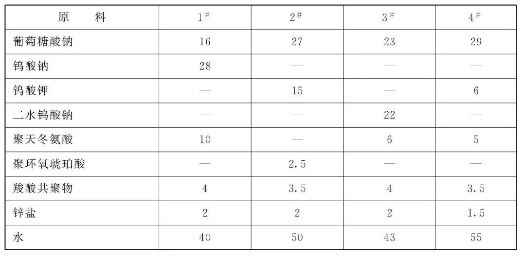 [原料配伍]本品各组分质量份配比范围为:多羟基羧酸盐16~29、钨酸盐6~28、聚羧酸2~10、羧酸共聚物3~5、锌盐1.5~2.5、水39 ~55。