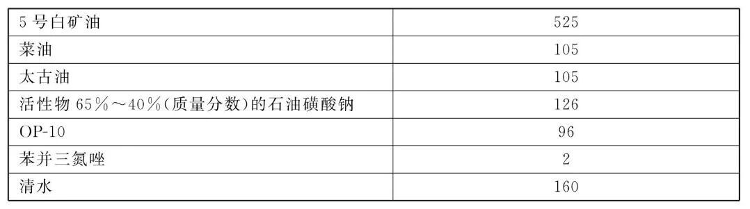 [原料配伍]本品各组分质量份配比范围为: 5号白矿油45~50,菜油6~10,太古油6~10,活性物65%~40%的石油磺酸钠10~14,OP-108~12,苯并三氮唑0.2 ~ 0.6,清水12~ 16。