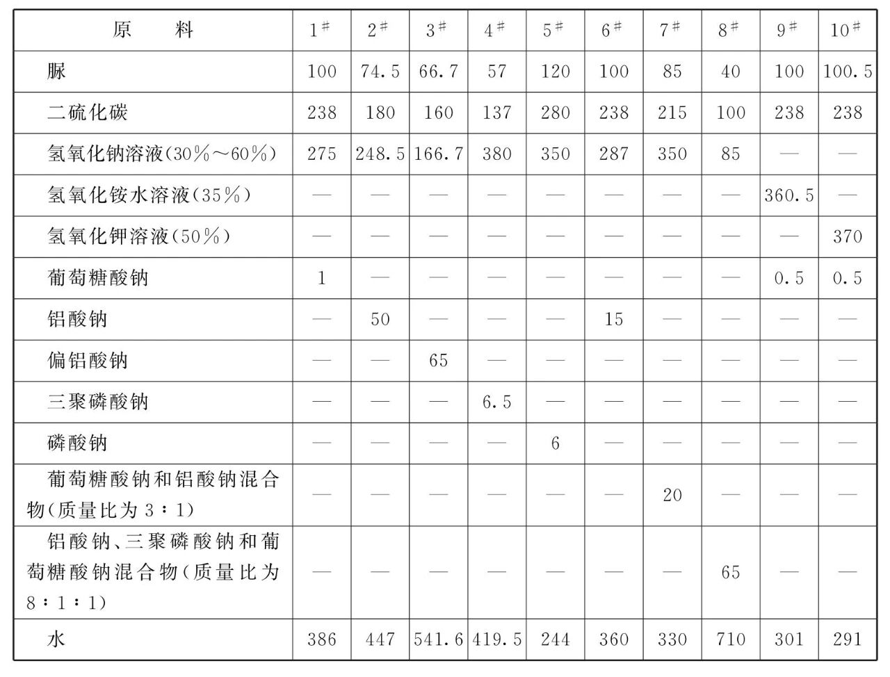[原料配伍]本品各组分质量份配比范围为:脲40 ~ 135、二硫化碳100 ~250、碱液80 ~ 400、添加剂5 ~ 65、水200~ 750。
