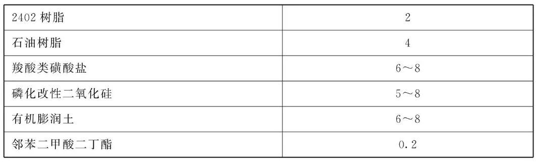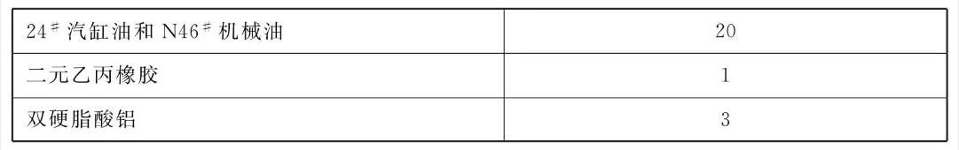 [原料配伍]本品各组分质量份配比范围为:羧酸类磺酸盐6~8,双硬脂酸铝2~4,磷化改性二氧化硅 5~8,有机膨润土6~8,二元乙丙橡胶0.5~ 1.5,2402树脂1 ~3,石油树脂3~5,邻苯二甲酸二丁酯0.1~0.3,24#汽缸油和N46#机械油15 ~25。