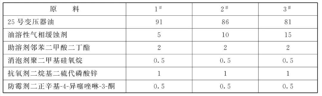本品各组分质量份配比范围为: 25号变压器油80~ 91、油溶性气相缓蚀剂5~ 20、助溶剂1~ 5、防霉剂0.5~1、消泡剂0.5 ~1、抗氧剂1~5。