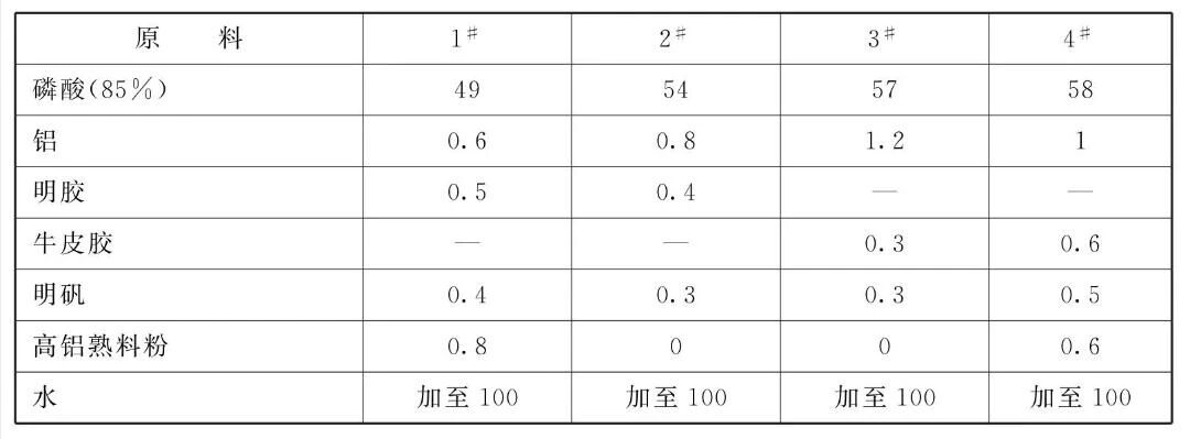 本品各组分质量份配比范围为:磷酸48~ 58、铝0.6 ~1.2、动物胶0.2~0.7、明矾0.2 ~0.6、 熟料粉0~0.8,水加至100。