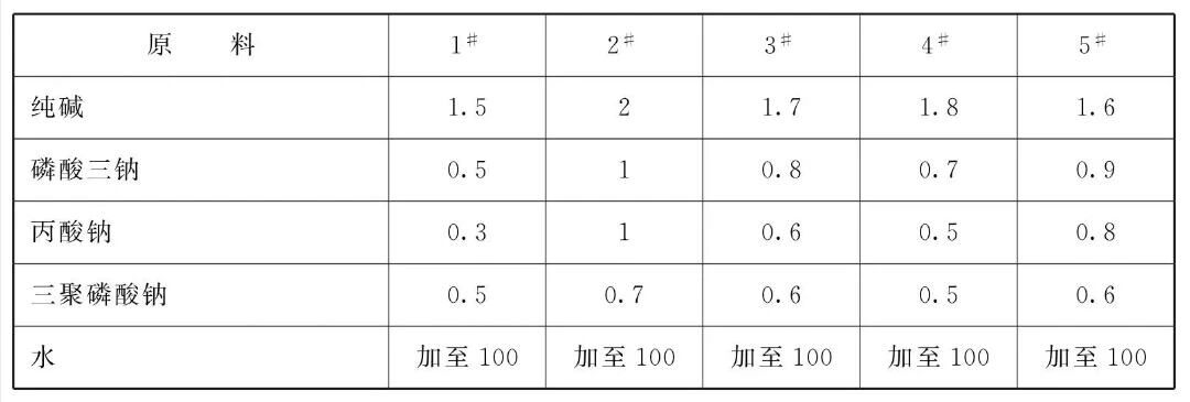 本品各组分质量份配比范围为:纯碱1.5~2、磷酸三钠0.5~1、 丙酸钠0.3~1、三聚磷酸钠0.5~0.7、水加至100。