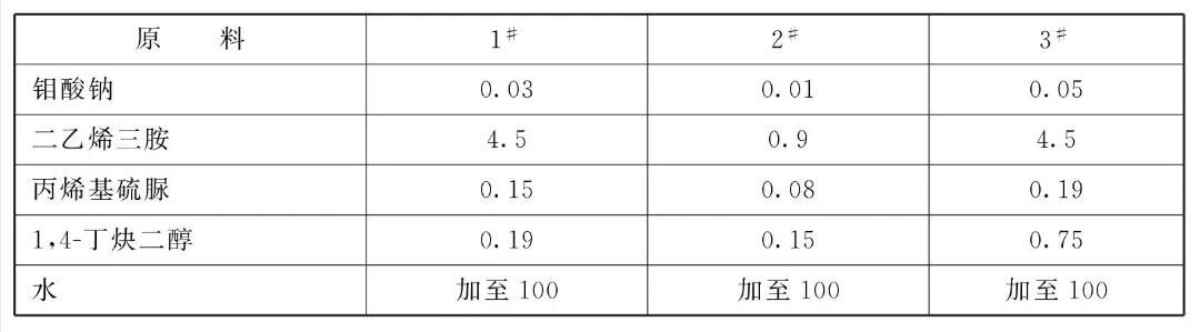 本品各组分质量份配比范围为:钼酸钠0.01 ~0.05、二乙烯三胺0.9~4.5、丙烯基硫脲0.08 ~0.19、1,4-丁炔二醇0.15~0.75、水加至100。