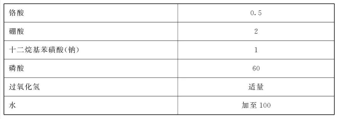 本品是由磷酸、铬酸、硼酸、水四种成分组成,还可加入过氧化氢,也可根据所处理的钢铁表面油污情况,在上述四种或五种成分中再加入十二烷基苯磺酸(钠)配方中磷酸用量为1% ~ 90%;硼酸用量小于4% ( 在0.5%左右),也可任意增减。十二烷基苯磺酸(钠)用量为1%左右(视工件上油污多少),也可以增减,最后用水稀释到需要的体积,经充分混合而成。