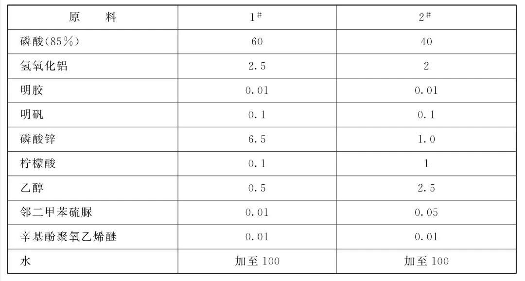 [原料配伍]本品各组分质量份配比范围为:磷酸( 85% ) 15~70、氢氧化铝2.5~4、动物胶0.01 ~ 0.1、明矾0.1 ~0.5、磷酸锌0.5~2、柠檬酸0.1~1、乙醇0.5~2.5、邻二甲苯硫脲0.01~0.1、辛基酚聚氧乙烯醚0.01 ~0.1、水加至100。