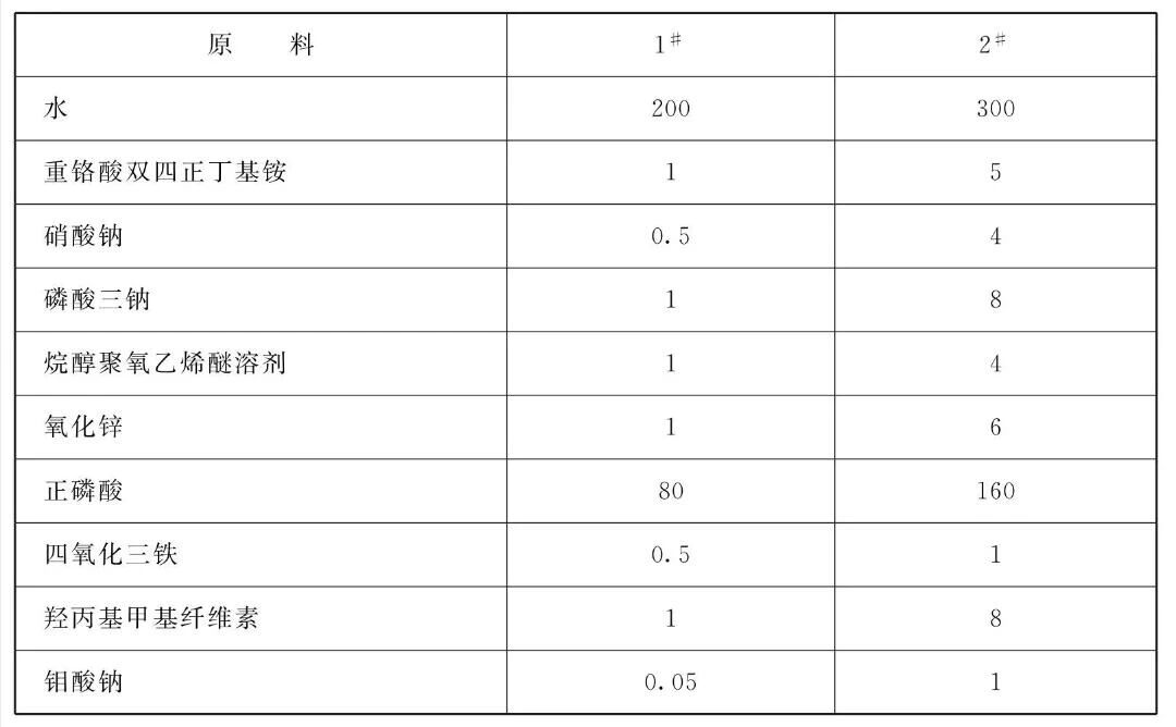 [原料配伍]本品各组分质量份配比范围为:水200~ 300,正磷酸80~160,重铬酸双四正丁基铵1 ~ 5,硝酸钠0.5~4,氧化锌1~6,磷酸三钠1~8,钼酸钠0.01~ 1,羟丙基甲基纤维素1~8,烷醇聚氧乙烯醚1 ~4。