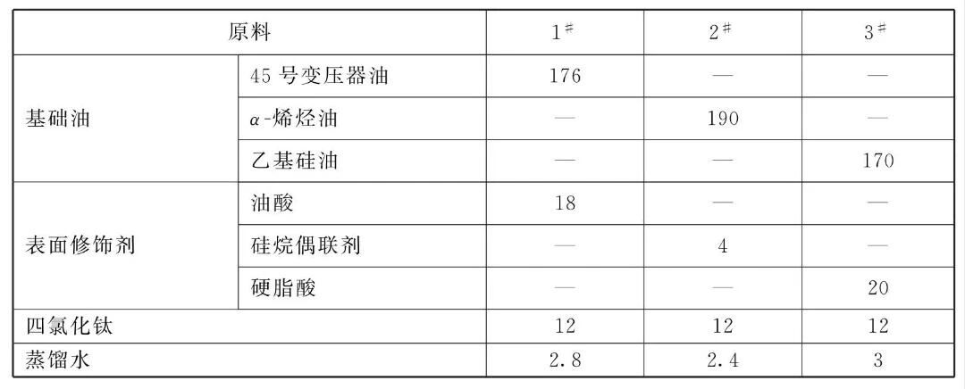 (1)取85~95份矿物油或合成油作基础油,加入2~10份的表面修饰剂——油酸或硅烷偶联剂或硬脂酸,强烈搅拌,缓慢滴加6份的四氯化钛,混合均匀;