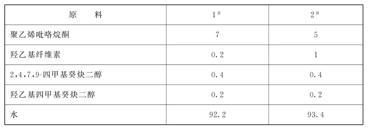 [原料配伍]本品各组分质 量份配比范围为:水溶性聚合物1~ 10、表面活性剂0.1~5、水85~98。