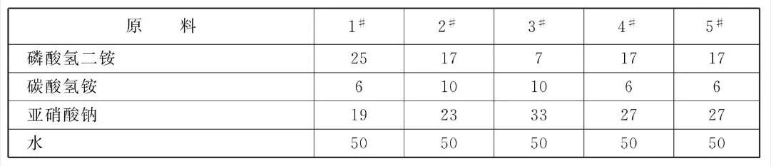 本品各组分质量份配比范围为:磷酸氢二铵17~19,碳酸氢铵5~6,亚硝酸钠27,水50。