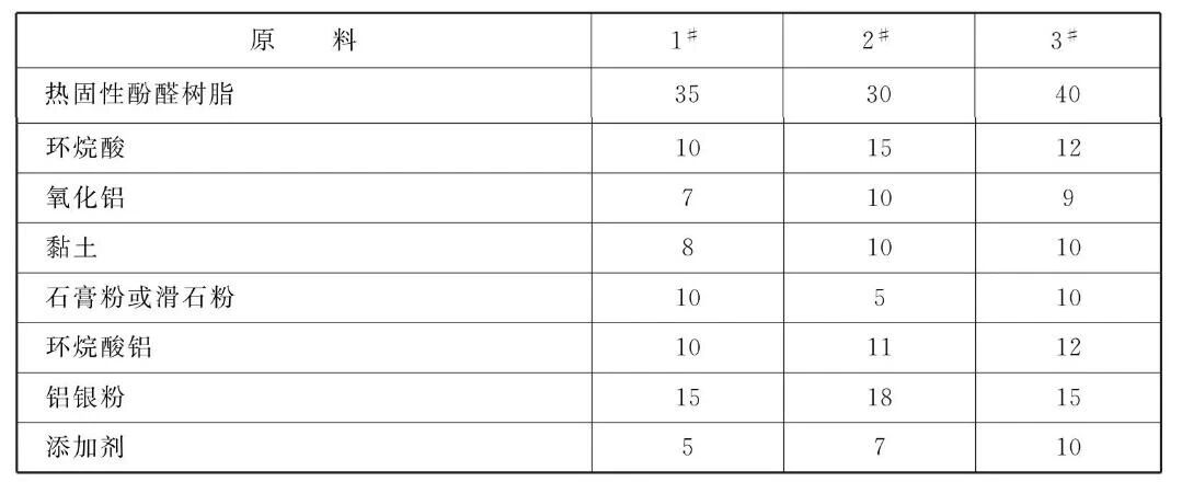 [原料配伍]本品各组分质量份配比范围为:热固性酚醛树脂30 ~ 40、环烷酸10~ 15、氧化铝7~ 10、黏土8~10、石膏粉或滑石粉10~ 15、环烷酸铝10~ 12、铝银粉15~18、添加剂5~ 10。