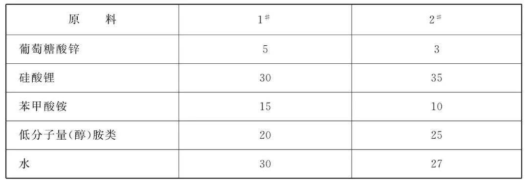 [原料配伍]本品各组分质量份配比范围为:葡萄糖酸锌3~7、硅酸锂25~35、苯甲酸铵10~ 18、低分子量(醇)胺类17~25、水27~35。