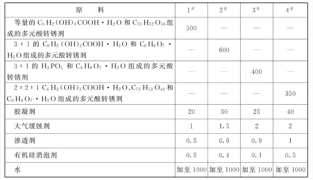 [原料配伍]本品各组分质量份配比范围为:多元酸转锈剂300~700、胶凝剂20~40、大气缓蚀剂1~2、渗透剂0.5~1、有机硅消泡剂0.1 ~0.5、水加至1000。