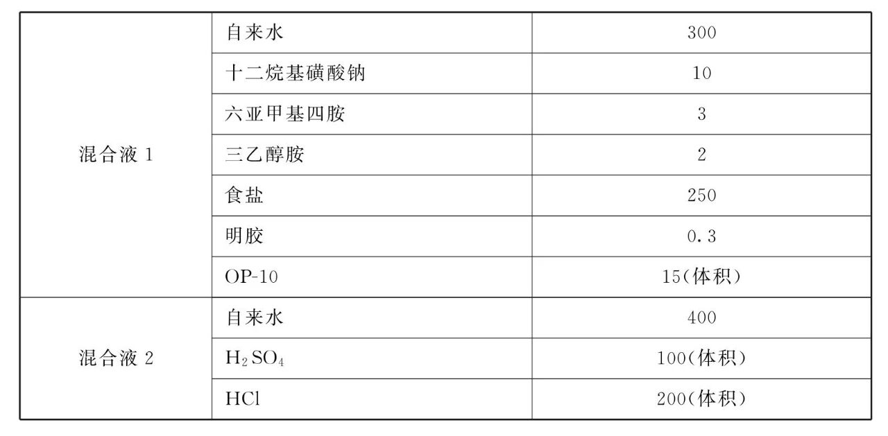 [原料配伍]本品各组分质 量份配比范围为:自来水300、十二烷基磺酸钠8~ 10、六亚甲基四胺2.5~4、三乙醇胺1.5~3、食盐200~ 300、明胶0.2~0.4、OP-10 12 ~ 20(体积)、自来水400、H2SO4 100~ 150(体积)、HCI 200 ~ 300(体积)。