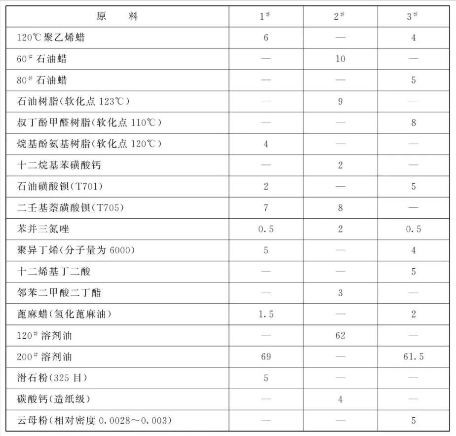 其中所用防锈剂为石油磺酸钡、二壬基萘磺酸钡、苯并三氮唑、十二烯基丁二酸等;所用的填料为碳酸钙、滑石粉、云母粉等,这些填料通过高速搅拌分散于防锈蜡组合物中,使得到的膜丰满并有足够的膜厚;所用溶剂油为120#或200#溶剂油中的一种或两种。