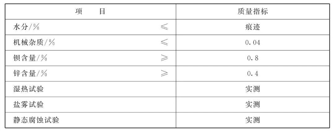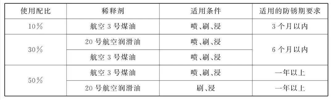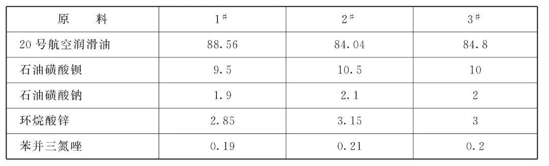 本品各组分质量份配比范围为: 20号航空润滑油80.56 ~89.04、石油磺酸钡9.5~ 10.5、石油磺酸钠1.9~ 2.1、环烷酸锌2.85 ~3.15、苯并三氨唑0.19~ 0.21。