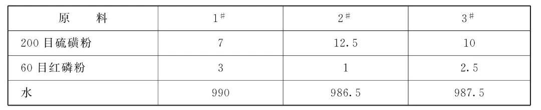 本品各组分质量份配比范围为:硫磺粉0.7~ 1.25,红磷粉0.1 ~0.3,水99.2 ~ 98.45。