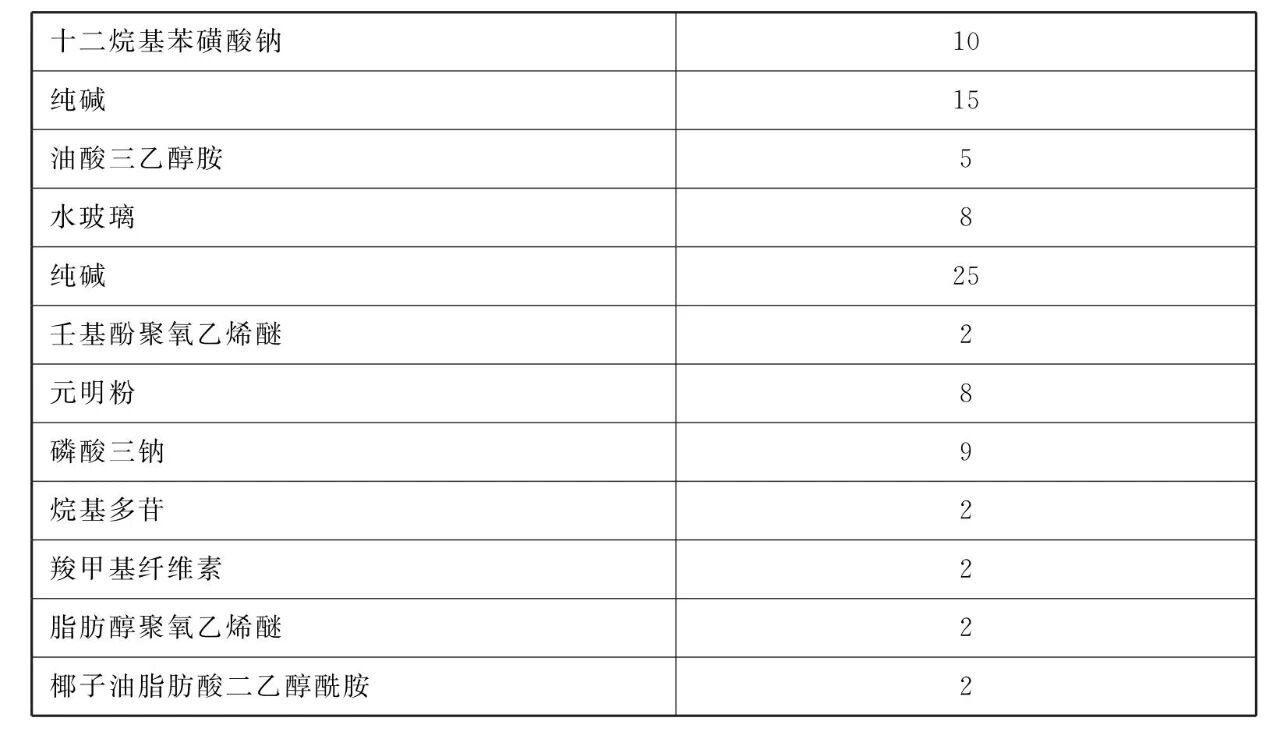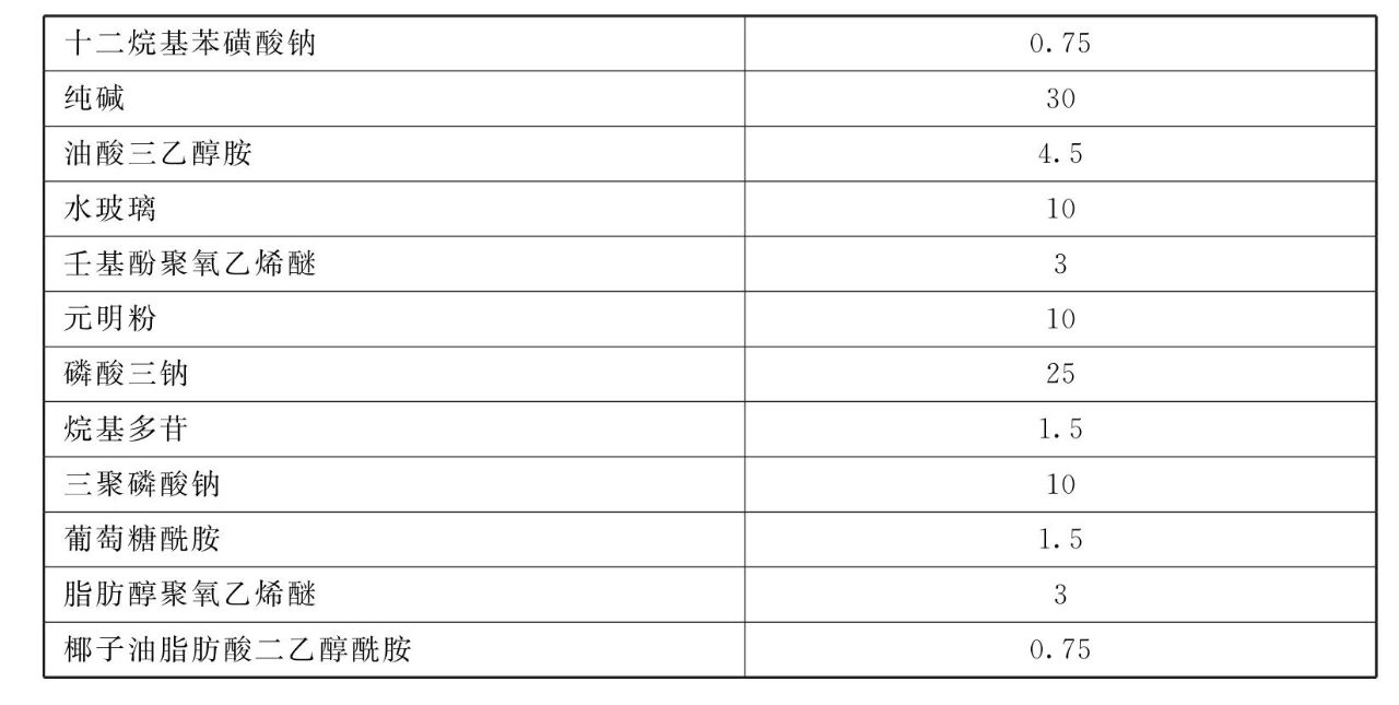 [原料配伍]本品各组分质 量份配比范围为:十二烷基苯磺酸钠0.2 ~ 10、纯碱0~ 30、油酸三乙醇胺0.2~6、烧碱0~10、壬基酚聚氧乙烯醚0.2~2、水玻璃3~10、脂肪醇聚氧乙烯醚0.2~2、元明粉0~ 10、椰子油脂肪酸二乙醇酰胺0.2~2、磷酸三钠0~30、烷基多苷0.2~2、三聚磷酸钠0~ 15、葡萄糖酰胺0.2~2、乙二胺四乙酸0~ 2、 羧甲基纤维素0~ 2。