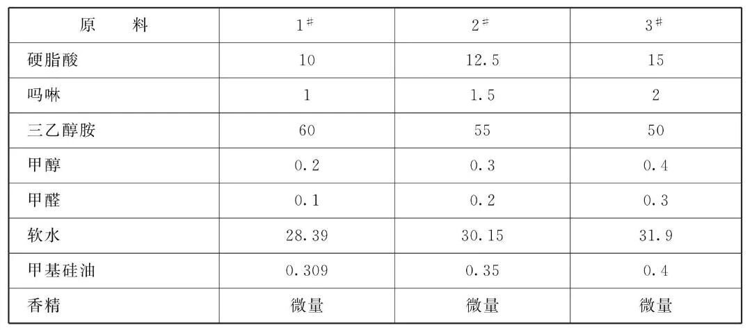 本品中各组分的质量百分比配比范围为:硬脂酸10~ 15、吗啉1~2、三乙醇胺50~60、甲醇0.2~0.4、 甲醛0.1 ~0.3、软水28.3~31.9、甲基硅油0.3~0.4、微量香精。