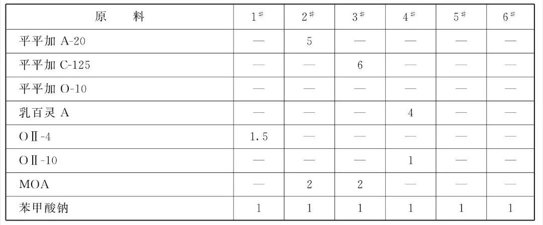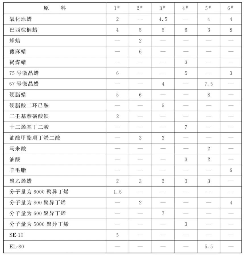 本品各组分质量份配比范围为:蜡10~20、防锈组分5~14、聚合物3~8、表面活性剂3~8、防腐剂1~2、水加至100。 其中所述的蜡物质是75~85号微晶蜡、氧化地蜡、蓖麻蜡、巴西棕榈蜡、褐煤蜡、蜂蜡或它们的混合物;所述的防锈组分为高分子羧酸及其皂类( 如硬脂酸、油酸、马来酸、油酸甲酯顺丁烯二酸等)、酯类物质(硬脂酸乙酯、苯二甲酸二丁酯、羊毛脂),含胺化合物( 硬脂酸二环己胺、油酸三乙醇胺),石油磺酸钡、二壬基萘磺酸钡、苯并三氮唑、十二烯基丁二酸等或它们的混合物;聚合物是分子量2000 ~ 4000的聚乙烯蜡、分子量1000~8000的聚异丁烯,或它们的混合物;防腐剂是苯甲酸钠;表面活性剂是非离子型乳化剂,如油酸三乙酸胺、硬脂酸对氧氮己烷、高级醇磷酸酯钠盐,或它们的复配乳化剂。