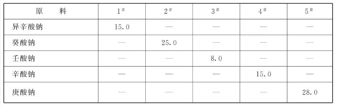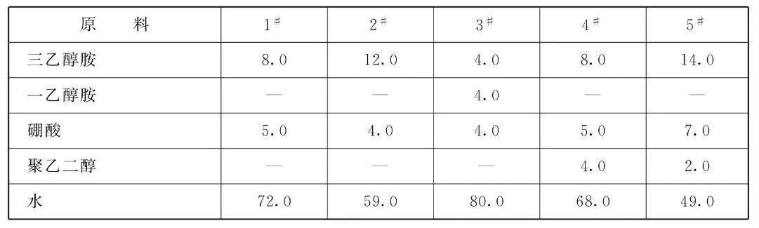 本品各组分质量份配比范围为:C8~C10羧酸盐5.0~30.0,乙醇胺5.0~ 15.0,硼酸类3.0~8.0聚乙二醇0.0~5.0,水42.0~87.0。其中: C.~C1。羧酸盐为其钾、钠盐或铵盐,以钠盐较好;乙醇胺为一乙醇胺、二乙醇胺、三乙醇胺中1~2种;