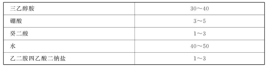 本品各组分质量份配比范围为:三乙醇胺30~40、硼酸3~5、癸二酸1~3、水40~50、乙二胺四乙酸二钠盐1 ~ 3、酚醚磷酸TXP-103~ 5、太古油3~ 8、485防锈剂3~5、二甲基硅油0.3~0.5、荧光素钠黄1~3。