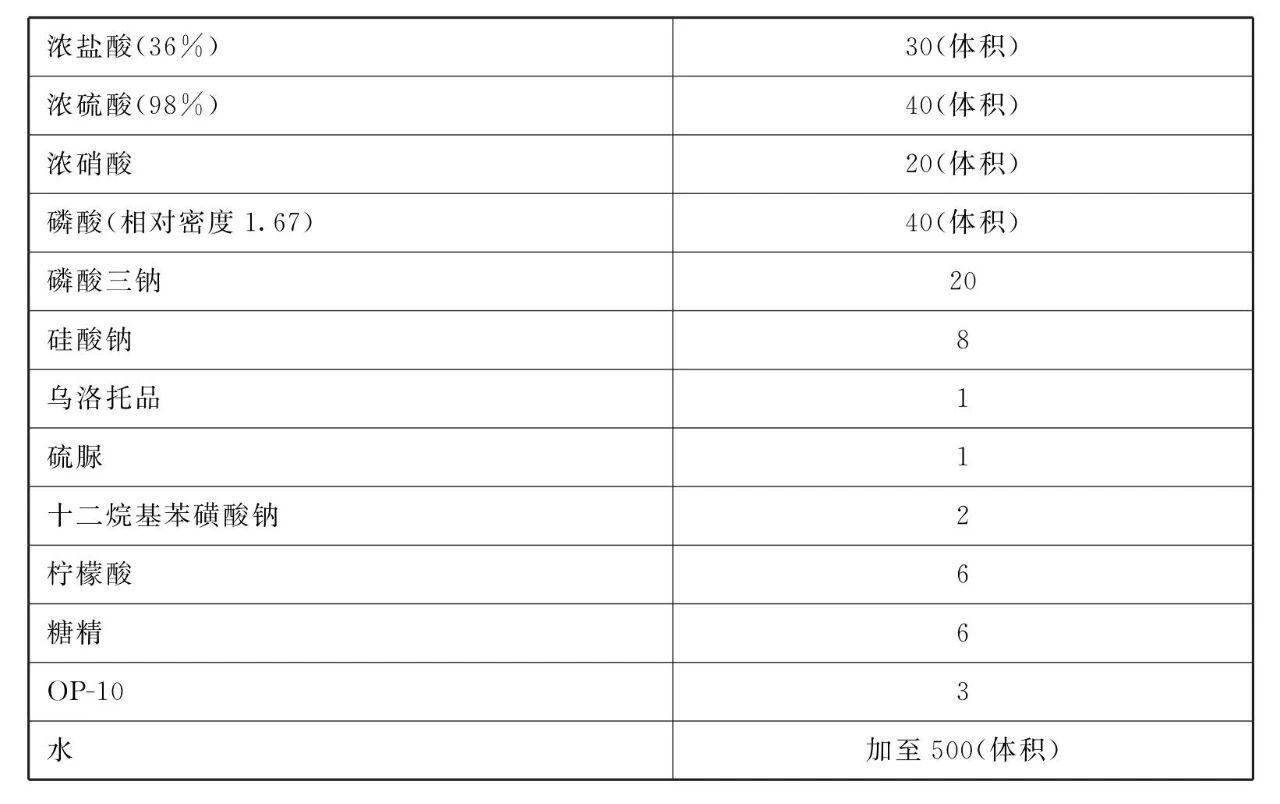 [原料配伍]本品各组分质量份配比范围为:浓盐酸(36%)5 ~ 40(体积)、浓硫酸(98%)10 ~ 60(体积)、浓硝酸5 ~ 40(体积)、磷酸(相对密度1 .67)5 ~ 60(体积)、磷酸三钠5~30、硅酸钠5~10、乌洛托品0.5~3、硫脲0.5~3、十二烷基苯磺酸钠0.5~5、柠檬酸1~10、糖精0.5~ 10、OP-100.5~ 6、水加至500(体积)。