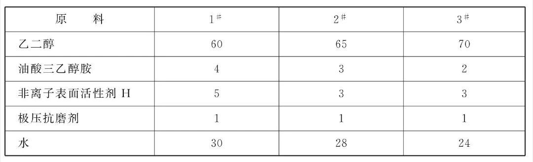 本品各组分质量份配比范围为:乙二醇60~ 70、油酸三乙醇胺2~4、非离子表面活性剂H3~5、极压抗磨剂1、水24~ 30。