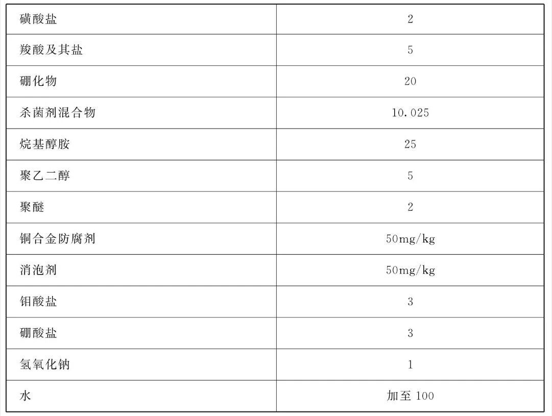 本品中各组分的质量配比范围是:磺酸盐1~5,羧酸及其盐3~10,硼化物15~30,杀菌剂混合物3~12,烷基醇胺15~30,聚乙二醇3~5, 聚醚为1~5,铜合金防腐剂50mg/kg,消泡剂50mg/kg,钼酸盐3~5,硼酸盐3~5,氢氧化钠1~2,水10~50。其中杀菌剂混合物由硼化物、特殊的羧酸盐、乙二胺四乙酸二钠 ( EDTA )组成。