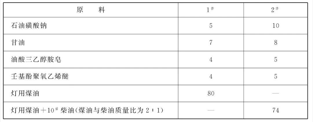 本品各组分质量份配比范围为:石油磺酸钠5~12、甘油5~ 10、 油酸三乙醇胺皂3~5、壬基酚聚氧乙烯醚3~5、煤油、柴油或其混合物70~ 80。