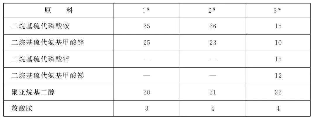 (1)将所称取的二烷基硫代磷酸盐、氨基甲酸盐、聚亚烷基二醇、羧酸胺、苯甲酸钠、乙内酰脲混合在一起后,搅拌均匀;