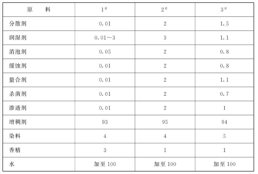 本品各组分质量份配比范围为:分散剂0.01~2、润湿剂0.01 ~ 3、消泡剂0.01~2、缓蚀剂0.01 ~ 2、螯合剂0.01 ~2、杀菌剂0.01 ~ 1、渗透剂0.01 ~ 10、增稠剂93~95、染料1~5、香精1~3、水加至100。