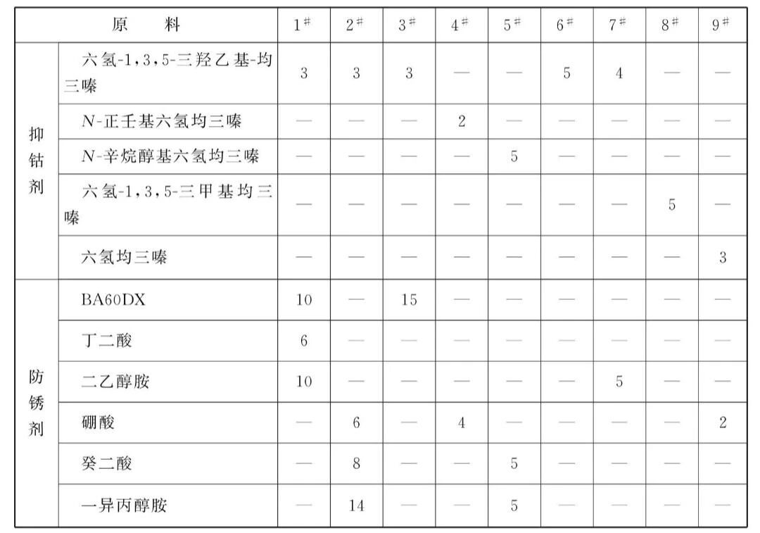 本品各组分质量份配比范围为:抑钴添加剂0.1 ~8、防锈剂0.5~40、润滑添加剂0.1~20、腐蚀抑制剂0.05~5、pH值调整剂0.2~20、乳化剂0.5~40、余量为水、基础油和其他助剂。