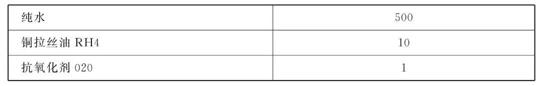本品各组分质量份配比范围为:纯水480~ 520、铜拉丝油RH49~ 11、抗氧化剂0201。