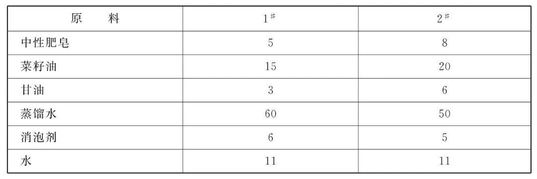 易镀,专业的表面处理交流平台 本品各组分质量份配比范围为:中性肥皂5~8、菜籽油15~20、甘油3~6、蒸馏水60~70、消泡剂6~8、水11~ 15。 易镀,专业的表面处理交流平台 本品主要应用于金属切削加工。原料配伍