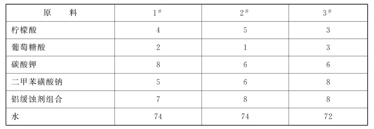[原料配伍]本品各组分质 量份配比范围为:柠檬酸1~8、葡萄糖酸1 ~8、碳酸钾3~ 12、二甲苯磺酸钠2~ 15、铝缓蚀剂组合3~ 12、水加至100。