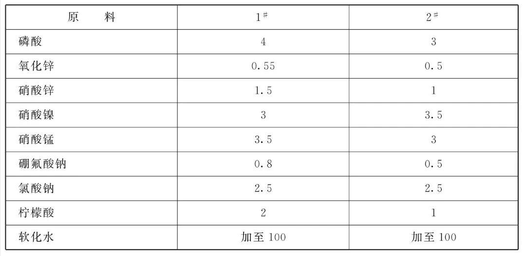 本品各组分质量份配比范围为:磷酸2~4、氧化锌0.4~0.6、 硝酸锌0.5~1.5、硝酸镍3 ~5、硝酸锰2~4、硼氟酸钠0.2~ 1、氯酸钠2~3、柠檬酸0.5~2、软化水加至100。