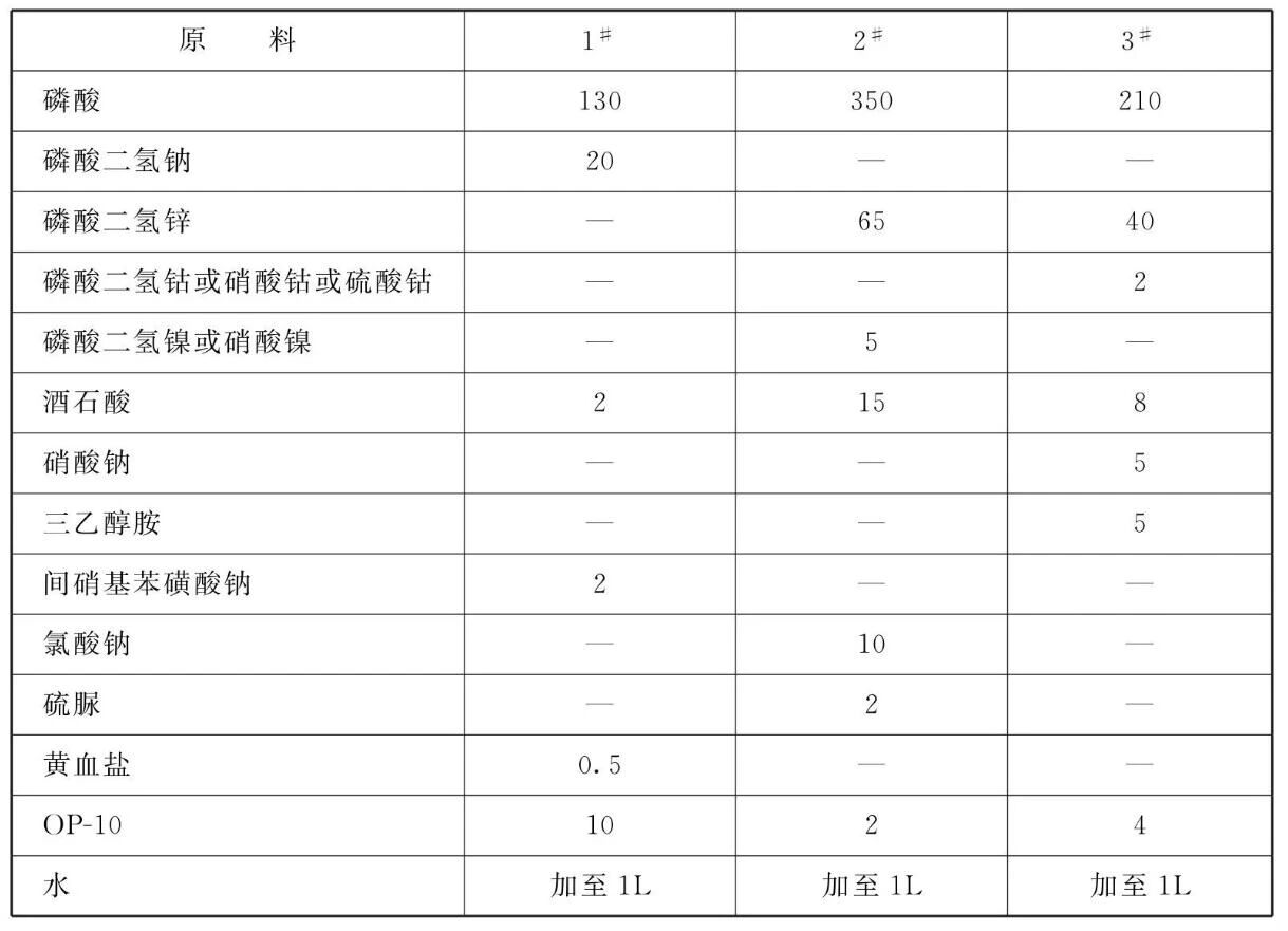 易镀,专业的表面处理交流平台 易镀,专业的表面处理交流平台 将原料加入水中,搅拌溶解均匀后加入OP-10乳化剂,即制成本品磷化液。 易镀,专业的表面处理交流平台 本品各组分质量份配比范围为(g/L):磷酸130~350、磷酸二氢盐5~70、促进剂1~10、添加剂0.01~10、酒石酸2~ 15、OP-101 ~10,水加至1L。 所述磷酸二氢盐为磷酸二氢锌、磷酸二氢钠、磷酸二氢钙、磷酸二氢镍或磷酸二氢钴。 所述促进剂为氯酸钠、间硝基苯磺酸钠或硝酸钠。 所述添加剂为黄血盐、钼酸铵、三乙醇胺、硫脲或柠檬酸铵。 该磷化液的游离酸度为180~520点,总酸度为450~1400点,工作温度为-15~40°C,工作时间为0.5~15min。 易镀,专业的表面处理交流平台 本品主要应用于金属磷化。 使用方法:本品使用及涂敷方法十分简便,可用喷、涂等方法一次涂敷在工件表面上,对普通碳素钢不用水洗,合金钢可用水洗,然后采用自然干燥或热风干燥。磷化液使用期间,当游离酸度低于一定值时,补加新鲜磷化液使之游离酸度保持在一定值以上,继续使用而无废液排放。原料配比(质量份)
