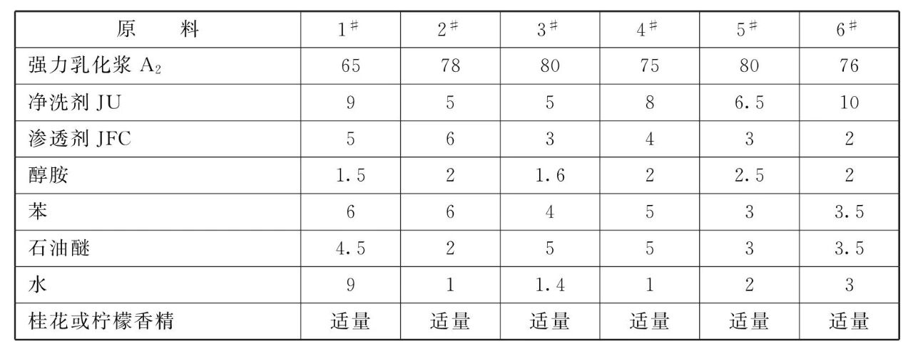 本品各组分质量份配比范围为:强力乳化浆A2 65~80、净洗剂JU 5~ 10、渗透剂JFC 2~6、醇胺 1.5~3.5、苯类3~8、石油醚2~6、水1~10。