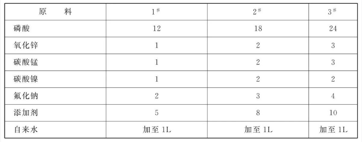 易镀,专业的表面处理交流平台 易镀,专业的表面处理交流平台 取自来水,取磷酸、氧化锌,加入水中,充分搅拌溶解;取碳酸锰,加入水中,充分搅拌溶解;取碳酸镍、加入水中,充分搅拌溶解,取氟化钠,加入水中,充分搅拌溶解。取添加剂,加入水中,充分搅拌,补水至1L。利用该磷化液对铁件、锌件和铝件进行磷化处理,浸渍、喷淋均可,磷化膜均匀致密,磷化效果很好。 易镀,专业的表面处理交流平台 本品各组分质量份配比范围为: 85%磷酸12~24、氧化锌1~3、碳酸锰1~3、碳酸镍1~2、氟化钠2~4、添加剂5~10、水加至1L。 易镀,专业的表面处理交流平台 本品主要应用于金属磷化。原料配比(质量份)