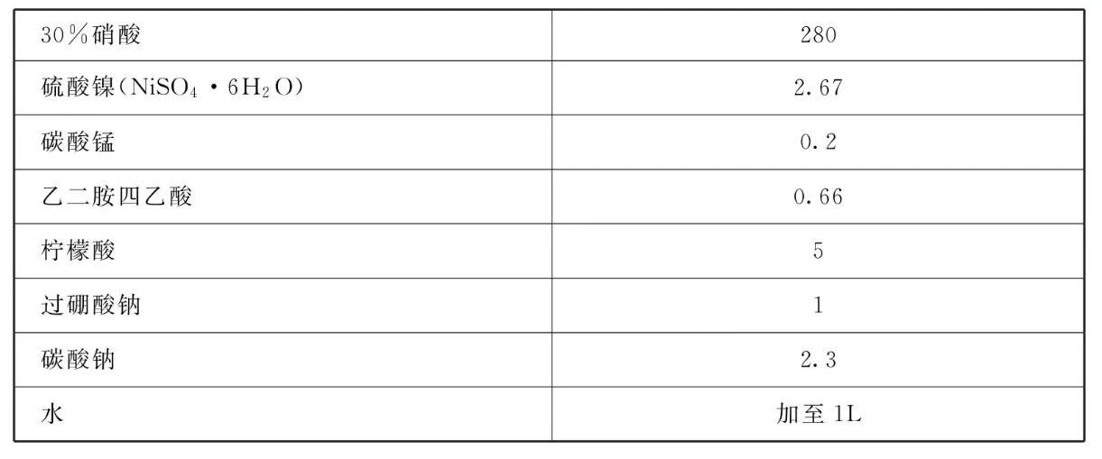 易镀,专业的表面处理交流平台 将各组分溶于水混合均匀即可。 易镀,专业的表面处理交流平台 本品各组分质量份配比范围为:氧化锌100、80%磷酸230、30%硝酸280、硫酸镍(NiSO4 .6H2O)2~3、碳酸锰0.1~0.3、乙二胺四乙酸0.6~0.7、柠檬酸4~6、过硼酸钠1、碳酸钠2~3,水加至1L。 易镀,专业的表面处理交流平台 本品主要应用于汽车制造、家用电器、农机等各类钢铁制品的涂装前处理,以增加其防腐能力和漆膜附着力,可采用喷淋或浸泡法处理。制备方法