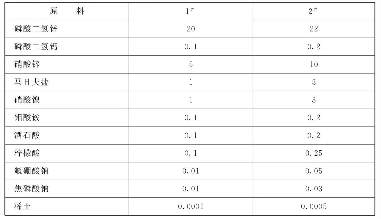 常温常压下,在反应釜中加入蒸馏水,加热至70~ 80°C时缓慢不停地搅拌,再依次加入磷酸、氧化锌、磷酸二氢锌、磷酸二氢钙、硝酸锌、马日夫盐,反应完全2 ~2.5h,冷却至45°C以下时按比例加入硝酸镍、钼酸铵、酒石酸、柠檬酸、氟硼酸钠、焦磷酸钠、稀土,搅拌,反应0.5~ 1h,化验检查,加水至密度为1.25~ 1.35,即可。