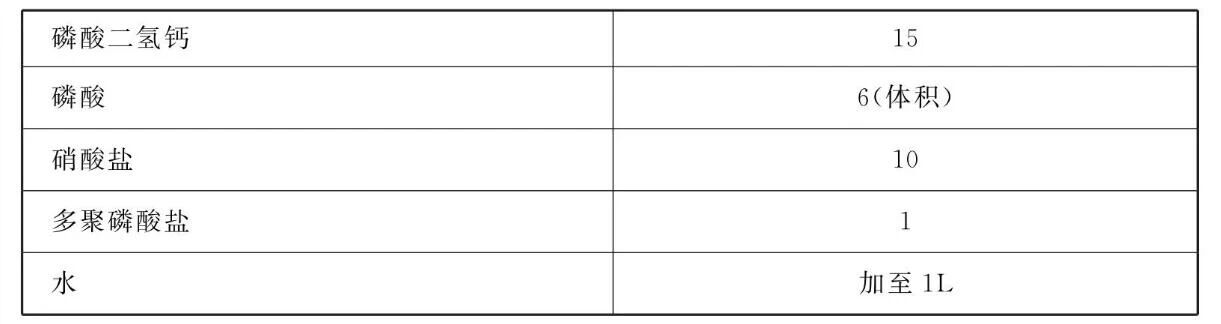 本品各组分质量份配比范围为:磷酸二氢钙5~80、磷酸2~15 (体积)、硝酸盐2~15、多聚磷酸盐0.1~5、水加至1L。