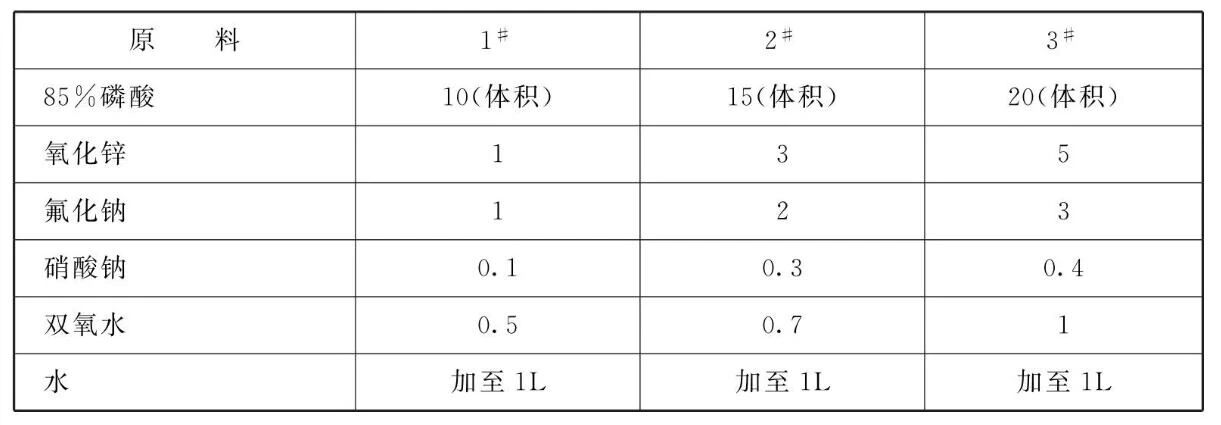 本品各组分质量份配比范围为: 85%磷酸10~20 (体积)、氧化锌1~5、氟化钠1 ~3、硝酸钠0.1 ~0.4、双氧水0.5~ 1、水加至1L。