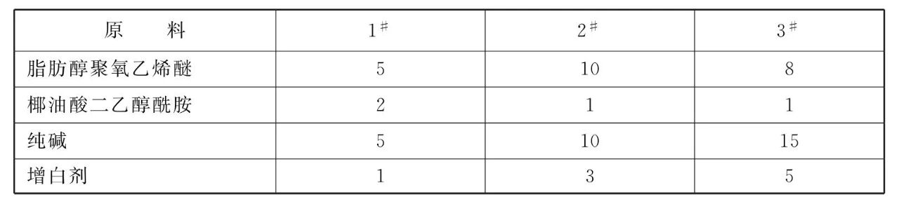 [原料配伍]本品各组分质量份配比范围为 :脂肪醇聚氧乙烯醚5~10、椰油酸二乙醇酰胺0.5~2、纯碱5~15、增白剂1~5、甘油0.5~1、防腐剂0.5~ 1、香精0.5~1、蒸馏水60~ 85。